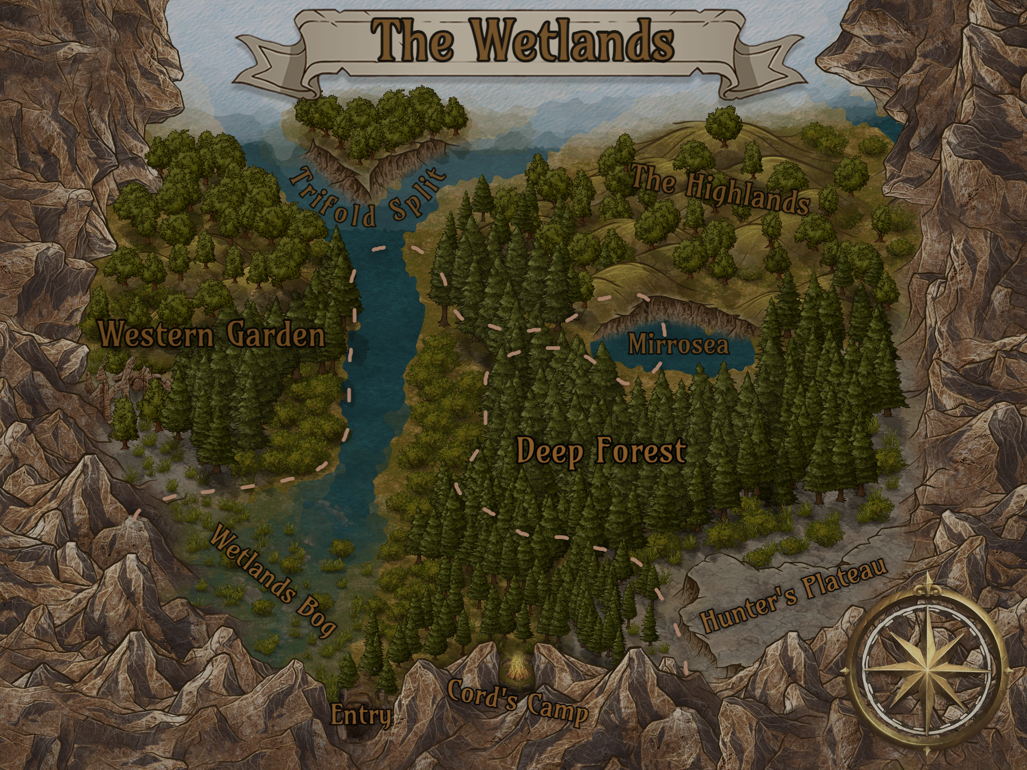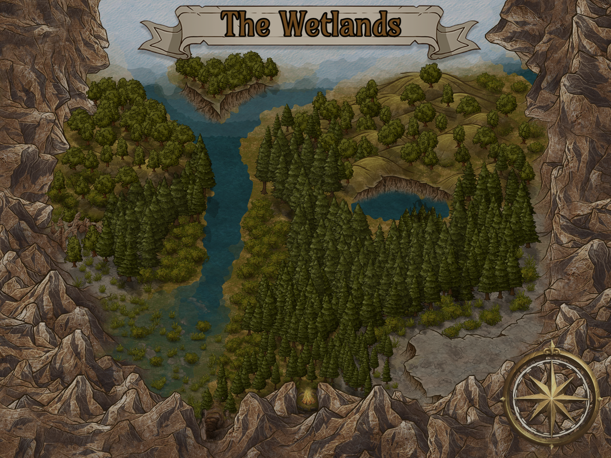 Einige Meilen südlich von Plentyful befindet sich ein Gebirgsrand mit unnatürlich feuchtem Sandboden und eine Häufung von Wüstenpflanzen. Folgt man diesen Vegetationsstreifen aufmerksam lassen sich Risse im Gebirge erkennen, kaum einen Meter breit, aus denen angenehm frische Luft strömt. Dahinter befindet sich eine riesige Grotte, die wahre Größe von dichtem Nebel verschleiert, doch könnte man meinen das gesamte Gebirge sei hohl. Die Landschaft aus dichtem Moos ist übersäht von hunderten Bäumen, wahrscheinlich mehr als in den gesamten Drylands zusammen. Es gibt kaum natürliches Licht, abgesehen von einem tiefblauen Fluss, der sich Richtung der Felswand in einer Art Moor verläuft. Der Fluss gibt einen schwachen Lichtschein ab, der jedoch ausreicht die umliegenden Bäume zu erhellen und halbwegs sichere navigation zu ermöglichen. Entlang des Flusses wachsen eine Vielzahl von Sträuchern und Büschen mit allerlei Beeren. Viele der Bäume sind von Pilzen umsäht, welche in keinem Pilzführer der Welt verzeichnet sind. Außerdem sammeln sich um Neuankömmlinge recht schnell einige Leuchtinsekten, die mit ihrem gelb-orangenen Schein leiten, oder vielleicht eher verwirren. Die Bewohner der Wetlands wissen sich zu verstecken, nur mit einem scharfen Auge kann man wenige Tiere erspähen, welche sich jedoch grundlegend von den Tieren der Drylands unterscheiden. Unter den bis jetzt beobachteten Wesen befinden sich Vögel mit pelzigen köpfen und einer Anzahl an Flügeln, die sich bei jedem Schlag zu verändern scheint, Reh-Artige wesen mit sechs Beinen und einer weißen Scheibe die immer vor dem Gesicht des Wesens schwebt, sowie gesichtslose Fische, die durch das dichte Moos der Wetlands schwimmen.